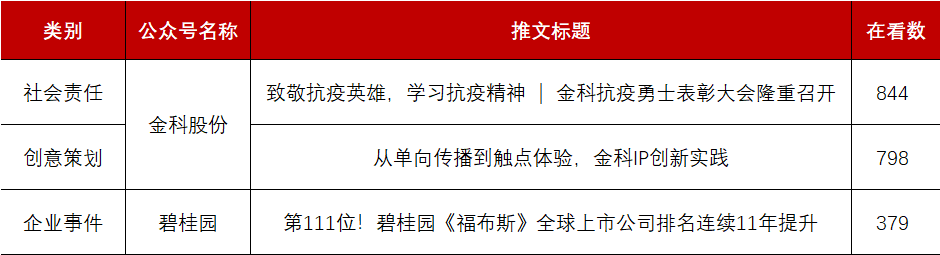 此外,从阅读量10W+爆款文章情况来看,TOP100房企官微单月共产出3篇10W+爆款文章。其中两篇出自金科集团,内容涉及社会责任与创意策划。以社会责任类内容为例,金科集团选择在510中国品牌日当天召开抗疫勇士表彰大会,通过推文的形式,与用户形成强互动,充分彰显企业家国情怀和责任企业形象,展现金科人的英勇风采。