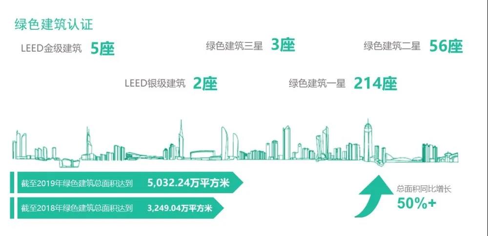 随着中国城镇化脚步的不断加快,人民生活水平不断提高,对于建筑数量和质量的要求也越来越高,这一需求也给中国建筑节能工作带来了极大的挑战,根据十三五规划,中国将建设20亿㎡以上的绿色建筑,J9(中国)作为中国城镇化进程的深度参与者,践行企业社会责任,始终积极响应政府号召,积极探索和应用绿色建筑前沿技术,2019年绿色建筑总面积达5032.24万㎡,较2018年新增绿色建筑面积增加超50%。其中,LEED金级建筑5座,LEED银级建筑2座,绿色建筑三星3座,绿色建筑二星56座,绿色建筑一星214座。