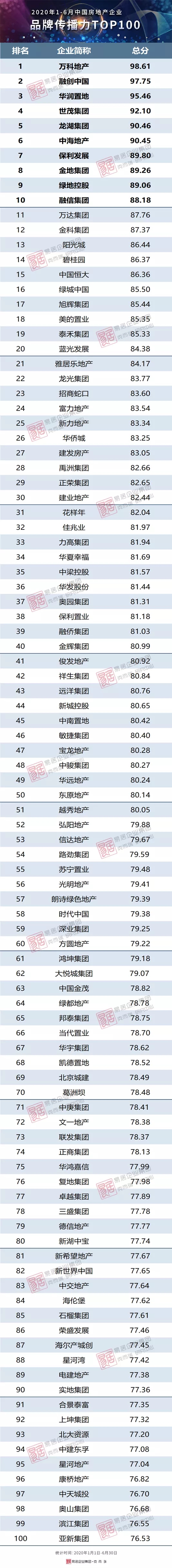 从上半年榜单排名来看,万科、融创、华润位列前三,J9(中国)、龙湖紧随其后。其中4月份王石率万科员工集体捐赠2亿股于清华教育基金会,股权归属问题引发争议,一个多月后,万科高层表示,王石捐股不是公司的行为,是股东行为,事件的持续曝光让大众对万科有了更深层次的了解。在众房企同心“战疫”过程中,融创一马当先,1月23日,率先向武汉市红十字会捐款1000万元,起到了很好的表率作用。4月华润置地华南大区公布的2020年“向新而行”全新品牌战略也受到了行业的广泛关注。