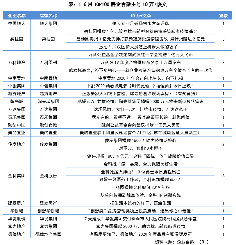 从官微运营10万+阅读量指标来看,热点主要集中在抗“疫”公益、智能产品、多元化发展等,也从侧面展现出,受疫情及行业的影响,在战略及品牌宣传上房企对产品的重视度愈发加强。恒大、万科、碧桂园、美的置业、金科等品牌房企在曝光度方面依然走在行业前列。