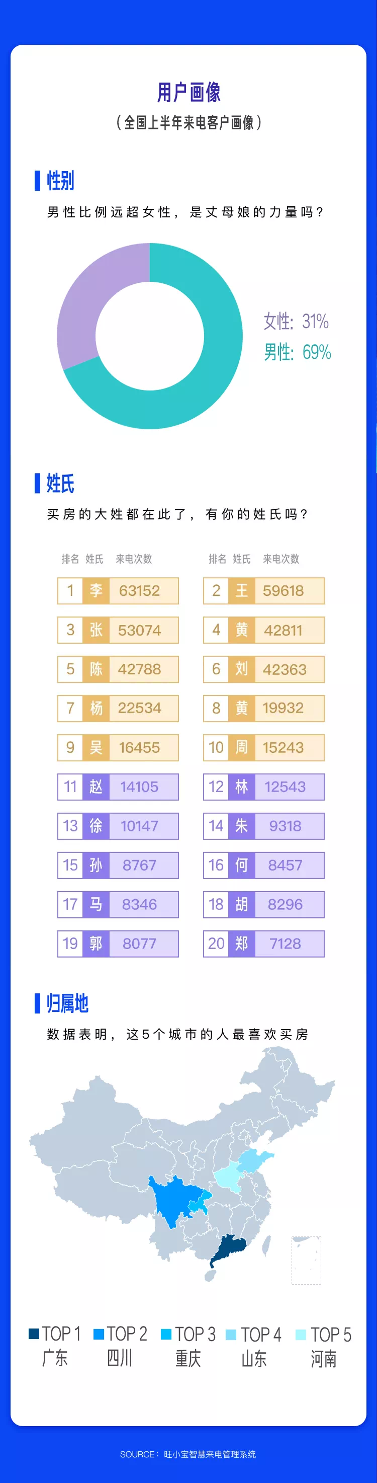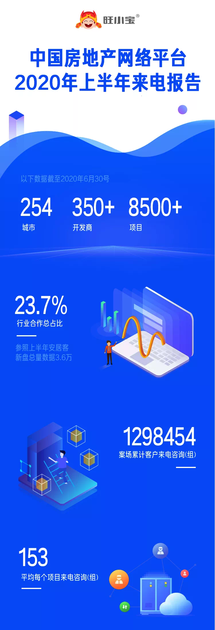 截至2020年6月30日,旺小宝的“房事”对象已扩展到全国254个城市的350+开发商,全国合作项目数达到8500+,行业合作总占比23.7%。案场累计客户来电咨询1298454组,平均每个项目来电咨询153组。