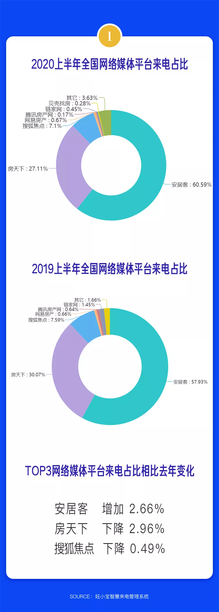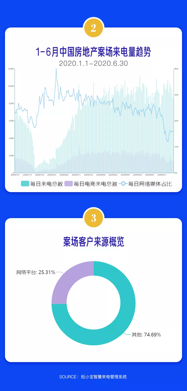 不过,每日网络媒体来电占比趋势却刚好与之相反。尤其从1月底至3月中旬这段时间,每日网络媒体来电占比达到峰值,由此可见在疫情严峻时期,售楼处停业,通过网络媒体线上咨询买房成为当时最主要的来电途径。从客户来源看,网络电商媒体平台上半年来电获客占比为25.31%。