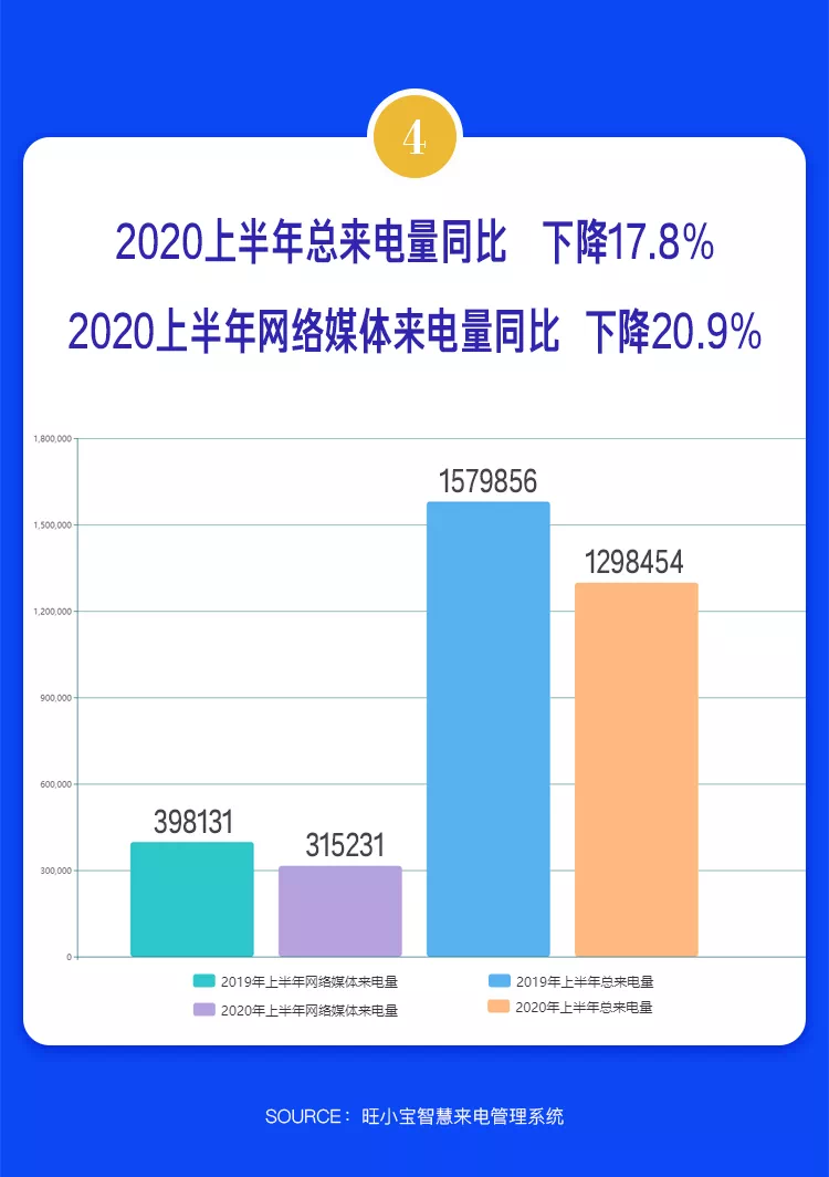 受疫情影响,第二季度复工复产加速推进,房地产市场才逐步恢复活跃。2、3月,线下售楼处关停,市场遭受重创,这也体现在来电量的大幅下滑方面。数据显示,2020年上半年总来电量同比下降17.8%,网络媒体来电量同比下降20.9%。数据可以大致反映今年上半年市场的整体找房热度。