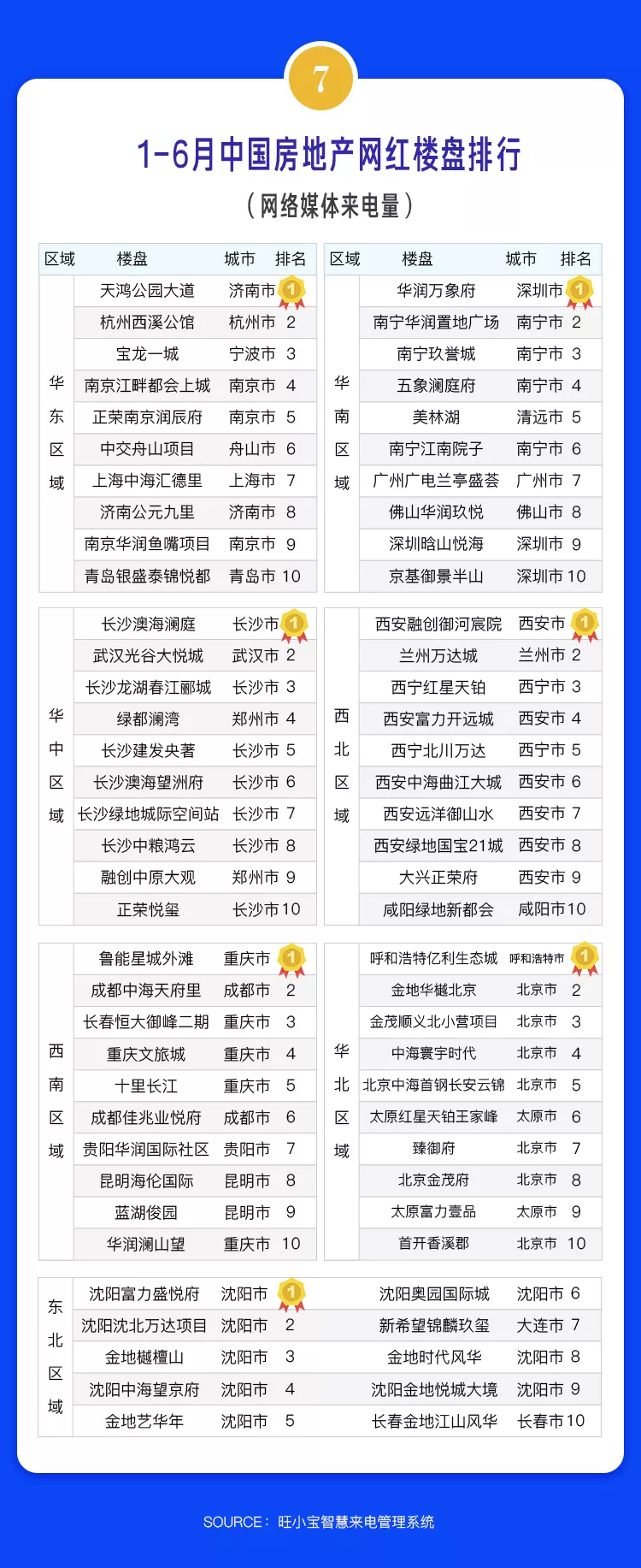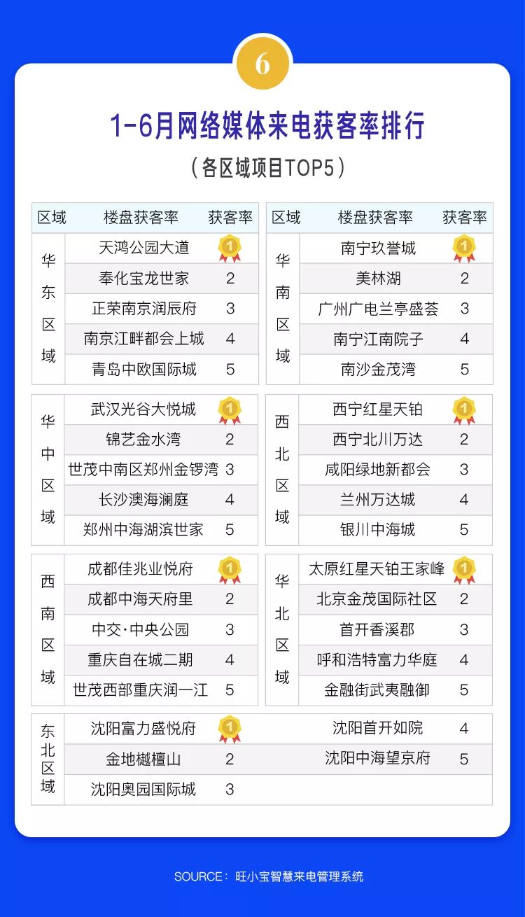 从上半年榜单看,沈阳富力盛悦府(东北区域)、天鸿公园大道(华东区域)、武汉光谷大悦城(华中区域)等项目在精细化管理和来电转化方面成效卓著。