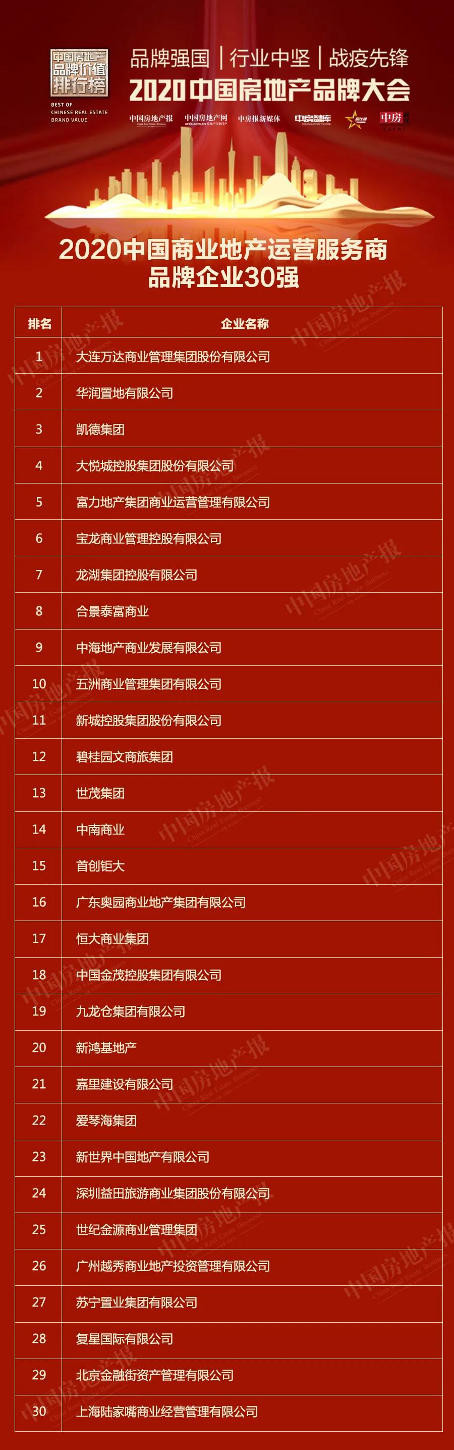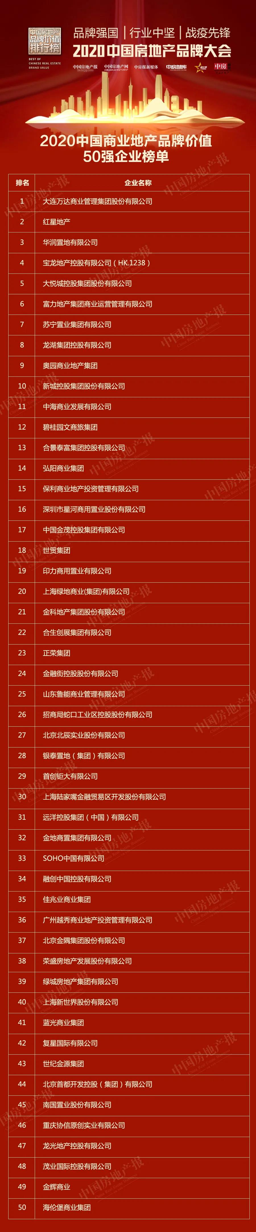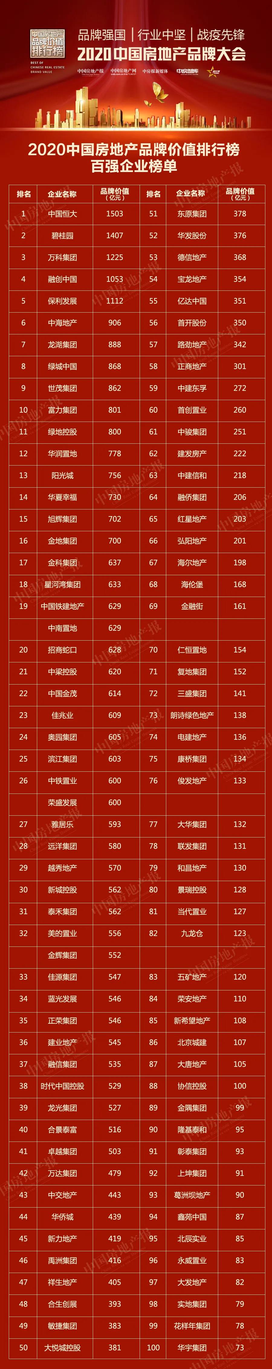 7月31日,在“品牌强国 行业中坚 战疫先锋 2020中国房地产品牌大会”上,中国房地产报、中国房地产网、中房报新媒体、中房智库联合发布了《2020中国房地产品牌价值排行榜》。