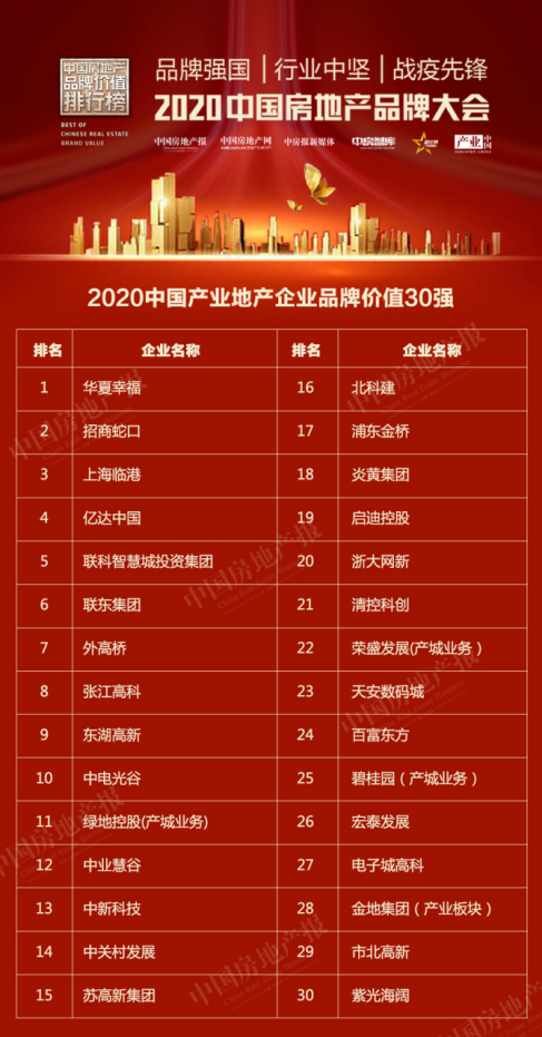 除了发布2020中国房地产品牌价值百强榜,大会还同期发布了相关细分领域的专业子榜单,包括《2020中国产业地产企业品牌价值30强》《2020中国未来科技产城融合运营商20强》《2020中国商业地产品牌价值50强》《2020中国商业地产运营服务商品牌企业30强》《2020中国文旅康养地产企业品牌价值TOP50》《2020中国地产百强房企优选供应商榜》。华夏幸福、招商蛇口、上海临港、亿达中国等30家企业入选“2020中国产业地产企业品牌价值30强”;中新集团、亿达中国、中电光谷等30家企业入选“2020中国未来科技产城融合运营商品牌价值20强”。