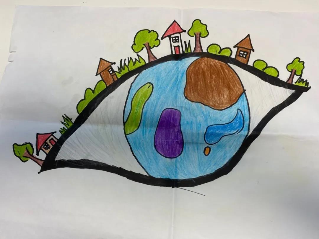 郭秉喆小朋友画了一只特别的眼睛,瞳仁是水蓝色的星球,葱绿的树和秀丽的家园化作睫毛守护它;