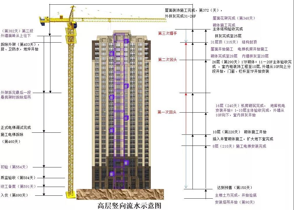 某房企将穿插施工分成横向和纵向,横向上,要求合理分段,紧密搭接;纵向上,要求保地下,抢屋面,并梳理出了全套的穿插施工做法及要点。如下是该房企制定的高层产品竖向流水示意图。