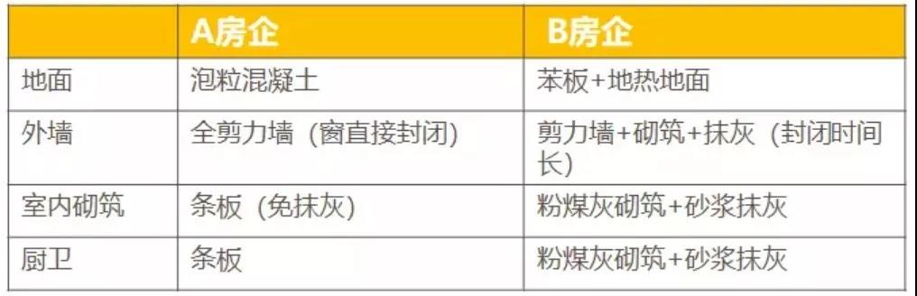 A房企土建移交精装花费了21天,精装第一道工序需要7天,而B房企则分别需要28天、17天,相比A房企工期多了17天。这主要是由于工艺不同所造成的,A房企引入的新工艺可以有效缩短工期。