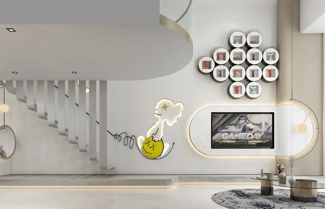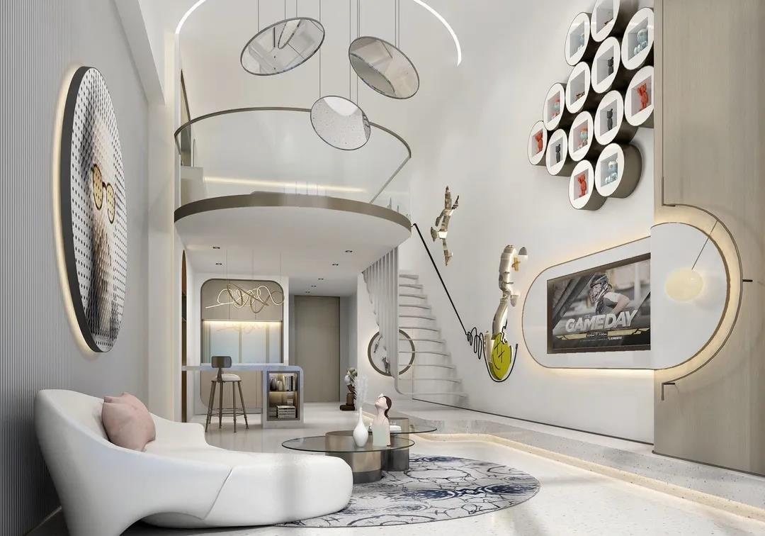 尤其在公寓类产品的设计中,更可充分利用层高的优势,将带挑空的客厅中大面积墙壁做整体性的展陈空间。