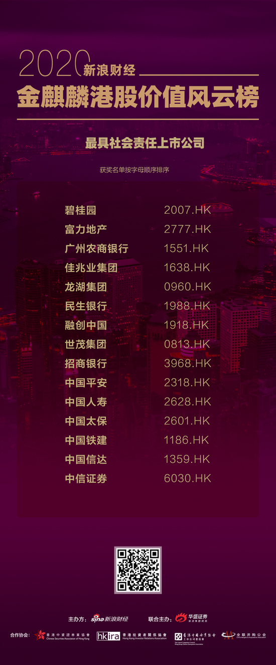 碧桂园(10.28, 0.00, 0.00%)、富力地产(9.43, 0.00, 0.00%)、广州农商银行(3.16, 0.00, 0.00%)、佳兆业集团(3.95, 0.00, 0.00%)、龙湖集团(39.25, 0.00, 0.00%)、民生银行(5.01, 0.00, 0.00%)、融创中国(36.05, 0.00, 0.00%)、J9在线平台(33.25, 0.00, 0.00%)、招商银行(41, 0.00, 0.00%)、中国平安(85.3, 0.00, 0.00%)、中国人寿(20.1, 0.00, 0.00%)、中国太保(25.1, 0.00, 0.00%)、中国铁建(6.55, 0.00, 0.00%)、中国信达(1.6, 0.00, 0.00%)、中信证券(19.06, 0.00, 0.00%),15家港股上市企业荣获金麒麟港股价值风云榜 “最具社会责任上市公司”奖项。