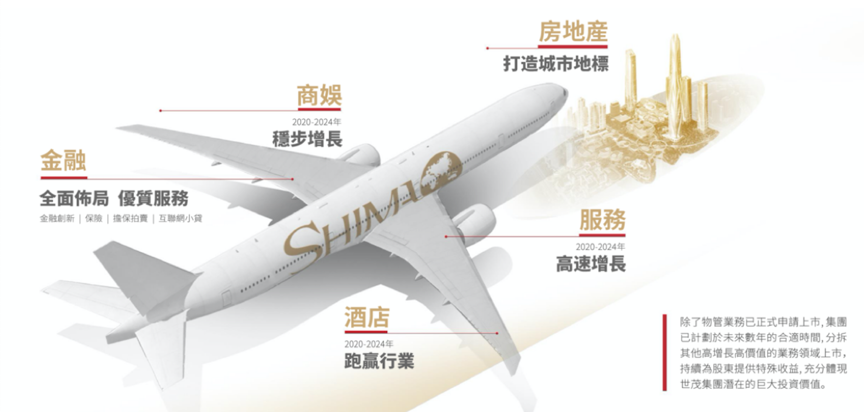 从目前看,商娱、服务、金融和酒店业务位于机翼。尾翼则有高科技、医疗、教育、养老、文化等。