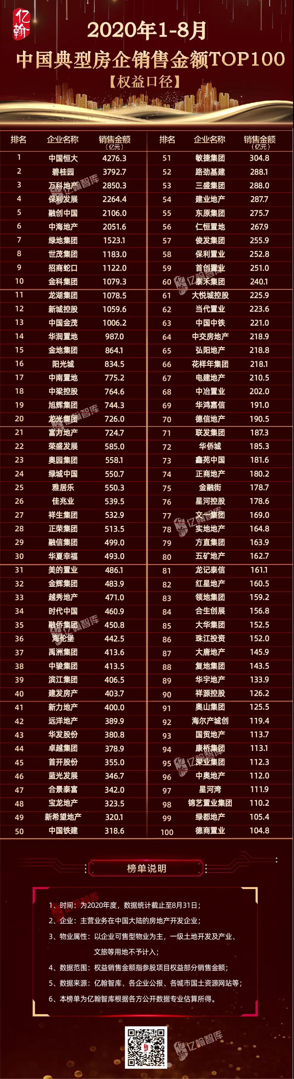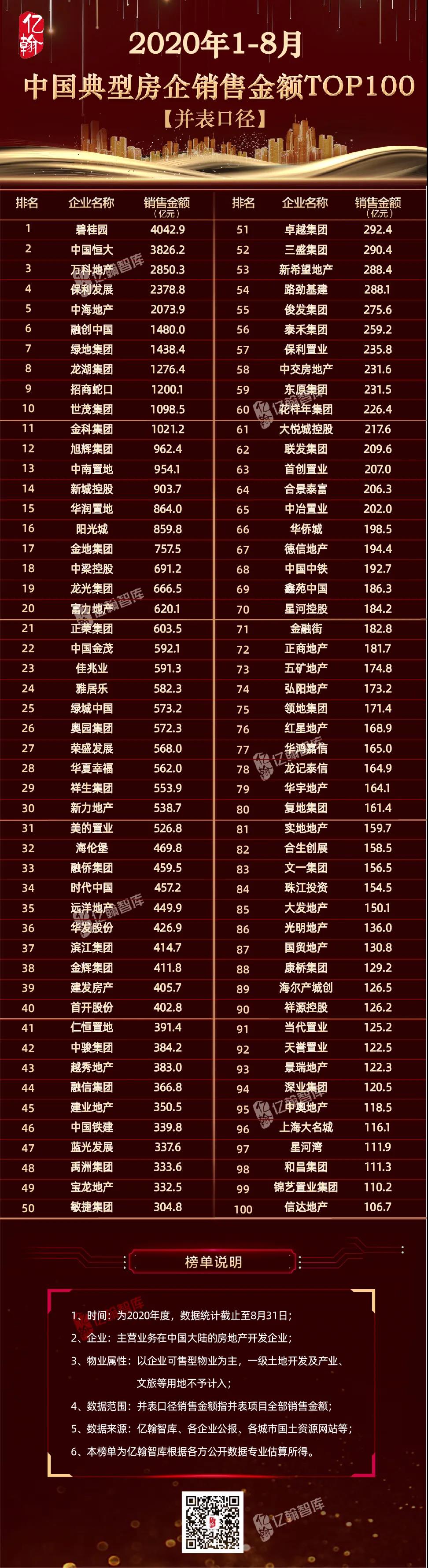 进入3季度,企业在推货或销售上的营销动作依旧保持原有节奏,销售业绩仍在不断修复,2020年1-8月各梯队房企门槛值均已恢复至2019年同期水平,其中,TOP10房企的门槛值为1603亿元,同比涨幅为9%,TOP30房企门槛值为701亿元,同比增长6%,TOP50房企门槛值为482亿元,增长了9%。