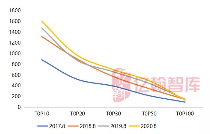 图表:2017.8-2020.8各梯队房企门槛值走势(亿元)