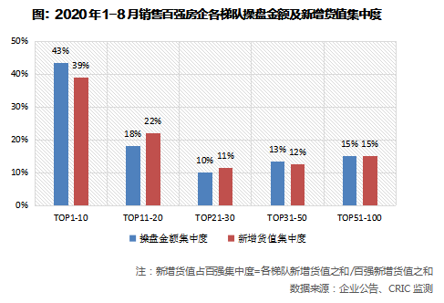 集中度来看,短期内强者恒强的格局不会被改变。销售TOP10房企1-8月新增货值集中度达到39%,第二梯队房企新增货值占百强的22%。换而言之,销售20强房企占据了六成新增货值。