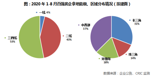 整体来看,百强房企拿地建面在能级、区域分布上依然稳定,一、二线城市占比合计47%,三四线城市占比53%,中西部、长三角仍是主要成交区域, 前8月成交占比分别达到37%和31%,而环渤海珠三角两个区域合计成交占比为32%。