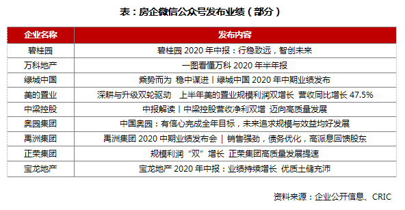 整体而言,本次业绩发布,房企愈加重视舆论的力量,通过展示第三方视角解读企业业绩增强社会对自身的信任感,如绿城中国,以“媒体看绿城——中期销售回款率95%,超七成土储项目位于一二线城市”,摘录了十多家媒体对绿城2020年上半年业绩的简要分析和评论,全方位多角度解读业绩数据,增强了企业良好的投资预期,提升公司品牌美誉。