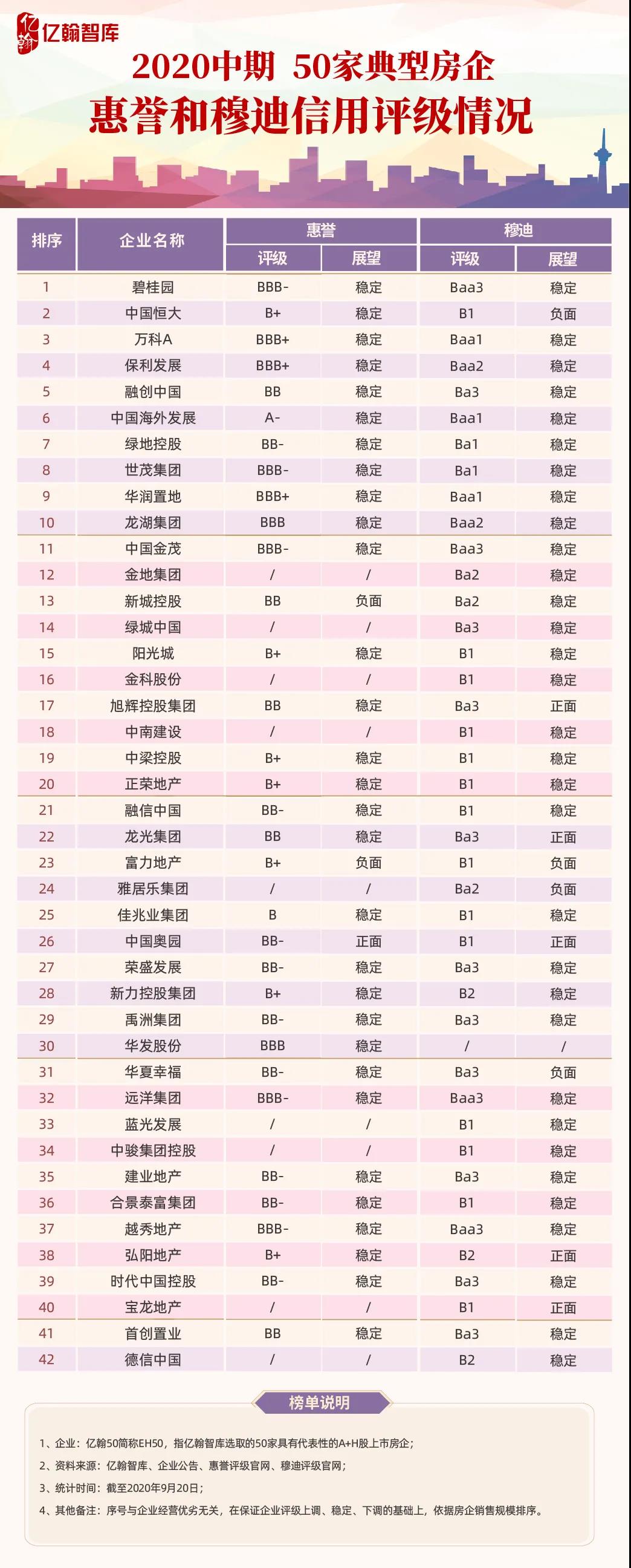 信用评级是房企综合实力的外现,尤其是公司资金实力的展示。我们统计EH50房企2020上半年国际评级变动情况发现房企评级整体变动不大,有4家房企评级上调,分别是碧桂园穆迪评级从非投资级Ba1上调至投资级Baa3,龙湖穆迪评级上调至Baa2,阳光城穆迪评级上调至B1,中南建设穆迪信用评级上调至B1,其中碧桂园高级无担保债券评级更是罕见的连跳两级上升至投资级“Baa3”,成为疫情环境下为数不多评级逆势而上的企业。