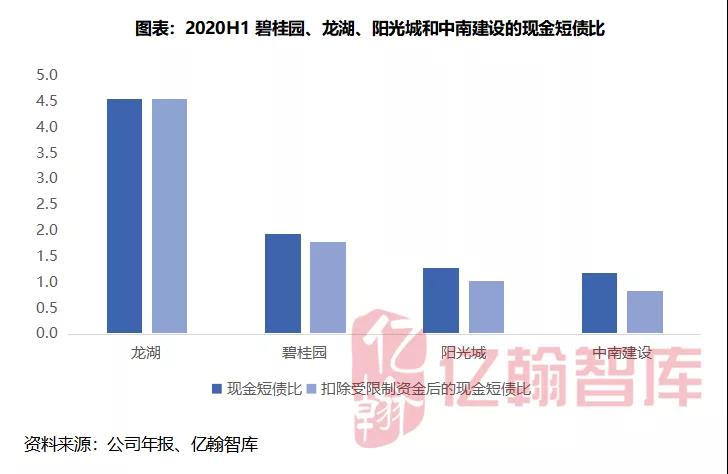 从短期偿债能力来看,四家企业现金短债比均高于1,也就是说货币资金能够完全覆盖短期有息负债,基本不存在短期偿债压力,但是在货币资金中存在一部分的受限制资金,若这部分资金规模占比较高,那么将影响企业的短期偿债能力。从四家房企来看,碧桂园、龙湖和阳光城在扣除受限制资金后的现金短债比依旧超过1倍,暂不用担心短期偿债压力,以碧桂园而言,公司上半年现金短债比为1.9倍,扣除受限制资金后的现金短债比为1.8倍,几乎没有偿债压力。中南建设在扣除受限制资金后的现金短债比则小于1倍,存在短期偿债压力。但是我们认为现金短债比是否高于1并不是评判企业有无偿债压力的依据,对于多数房企而言,凭借公司销售回款的增加以及在资本市场上的信用,具备较强的融资能力,即使短期有息负债偏高,对企业而言,仍难言具备较高的偿债压力。