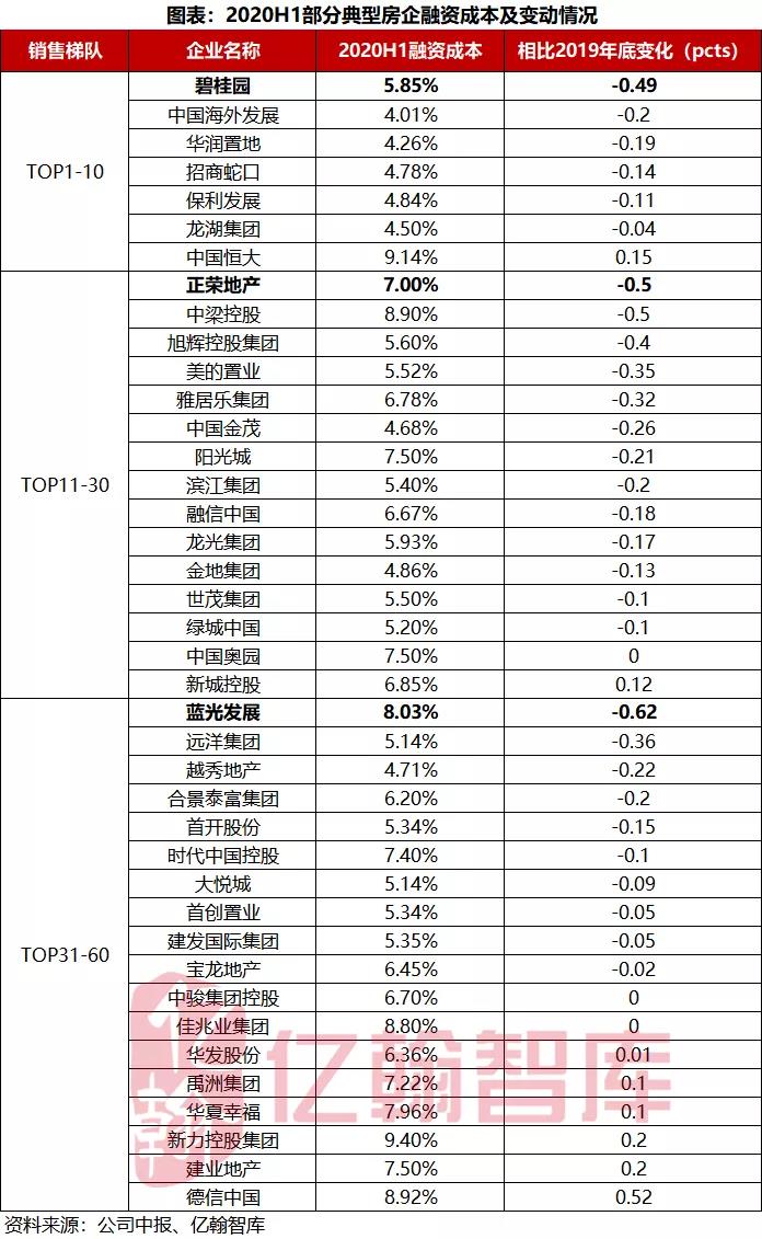 随着行业融资环境的收紧,强有力的融资能力将会是房企重要的优势。毋庸置疑,这四家房企评级上调都得益于公司具备较强的融资能力。根据典型房企融资成本变动情况来看,2020上半年,碧桂园融资成本为5.85%,相比2019年底下降0.49个百分点,下降幅度位于行业前列;阳光城融资成本为7.5%,相比2019年底下降0.21个百分点;龙湖集团一如既往保持较低的融资成本,为4.5%,相比2019年底下降0.04个百分点。上半年房企融资成本的下降,一方面是受融资环境边际放宽影响,政府采取的救市、救企举措使房企在短暂的时间内资金成本下降;另一方面是自身具备较强的融资能力,使公司在资本市场上拥有良好的信用,带来了资金成本的下行。