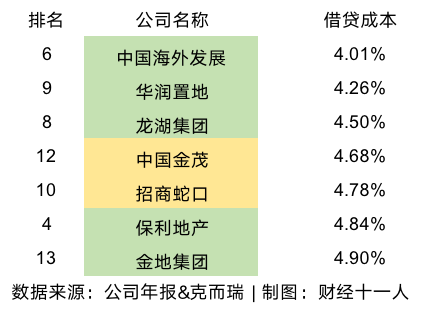 从借贷成本来看,5%以下的,除了龙湖,清一色都是国企央企背景,融资优势突出。