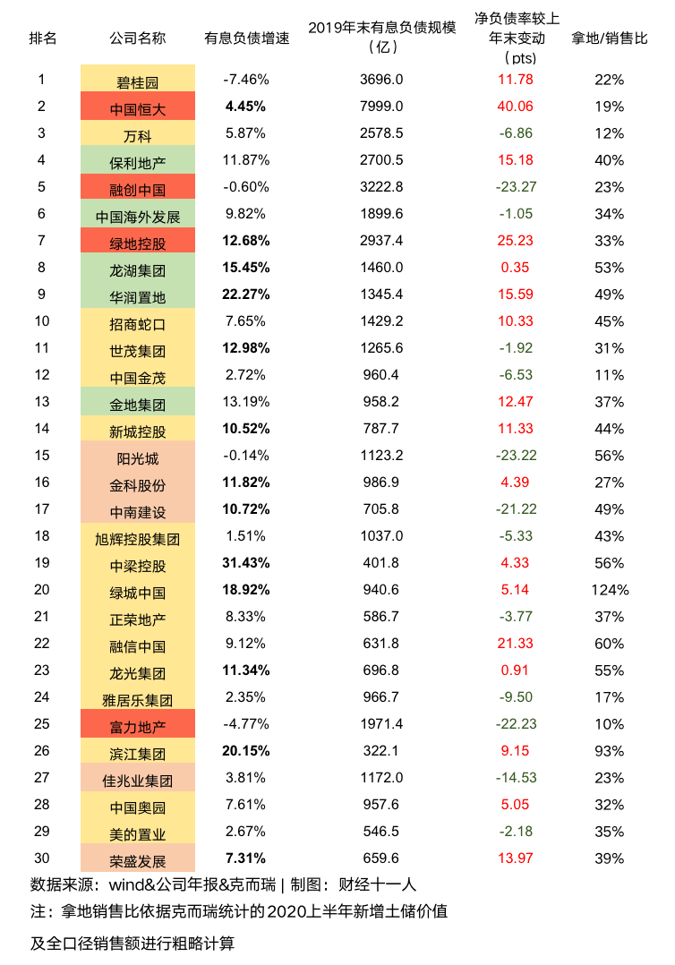 我们以2019年末的有息负债为基准,计算了2020上半年前30房企的有息负债增速。