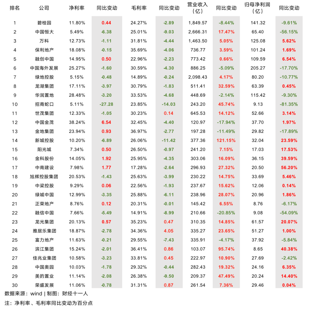 前30房企中,虽然上半年营收与归母净利润大多同比上升,但销售毛利率和净利率却呈下滑趋势:80%房企销售毛利率同比下降,66.67%的房企净利率同比下降。净利率在15%以上的有10家,在10%~15%的有12家,在10%以下的有8家。