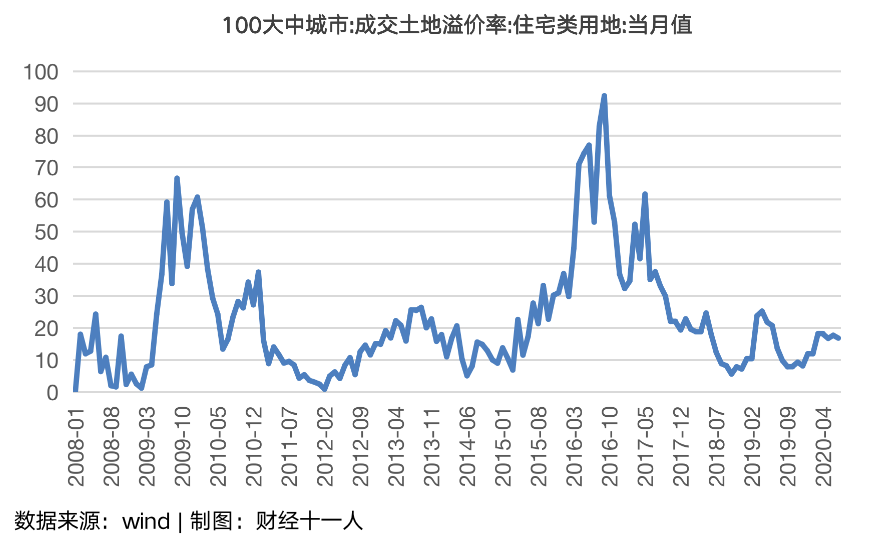 根据房地产销售的经营周期,2020年上半年结算的住宅项目大多是在2016年下半年及2017年获取的土地。从下图可以看到,彼时百城成交土地溢价率均处于高位。