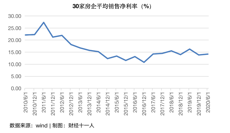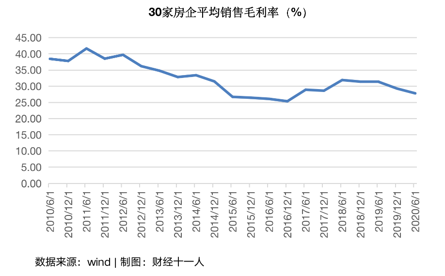 我们以这30家房企为样本,计算了自2010年以来的销售毛利与销售净利率均值(剔除当年未上市及异常值)。可以看到,这30家房企的毛利率和净利率总体趋势在下行。