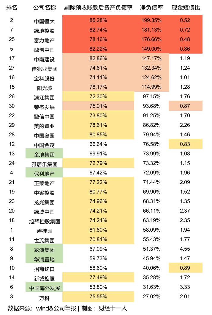 业内认为,如果房地产企业的资产负债率超过80%,就有相当的危险。类比股票市场:这相当于,有100元,却拿了500元去投资。市场价格下降20%,净资产就归零。按照80%的标准,30家企业中有7家不及格。