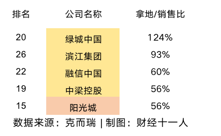 拿地销售比超过55%的企业算是比较激进的。这些企业是:绿城、滨江、融信、阳光城、中梁。根据我们的其他研究,这5家中除了绿城和滨江具有持续扩张的能力,其他3家,可能是“一时冲动”。