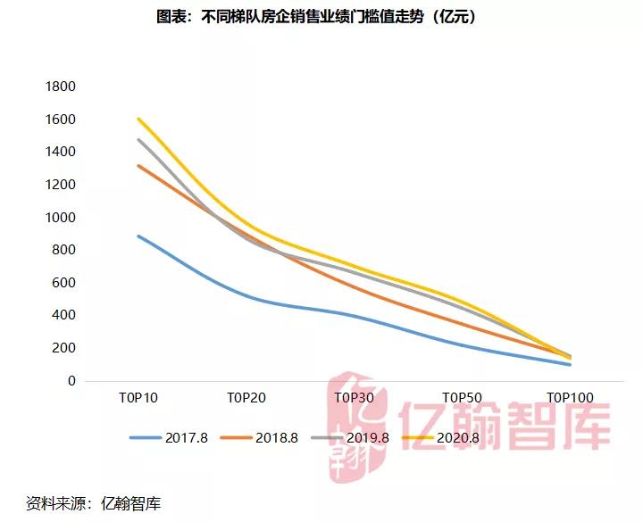 从2020年1-8月企业销售业绩来看,疫情给房企销售业绩确实造成了影响,特别是一季度,企业的业绩都出现陡降,一季度之后,伴随疫情负面影响的逐步消化,售楼处的逐步开放,房企的销售业绩开始逐渐恢复,至8月末,TOP50房企销售业绩门槛值均已实现转正。
