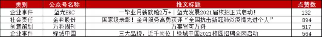 在10万+阅读量文章方面,9月份TOP100房企官微单月共产出四篇阅读量10W+爆款文章,较上月有所增加。9月份正值校招季,文章内容聚焦于校园招聘等企业事件类型,除文章内容引起关注者的共鸣外,契合校招时机紧跟流量热点也是该类推文获得高点击量及高赞的原因之一。