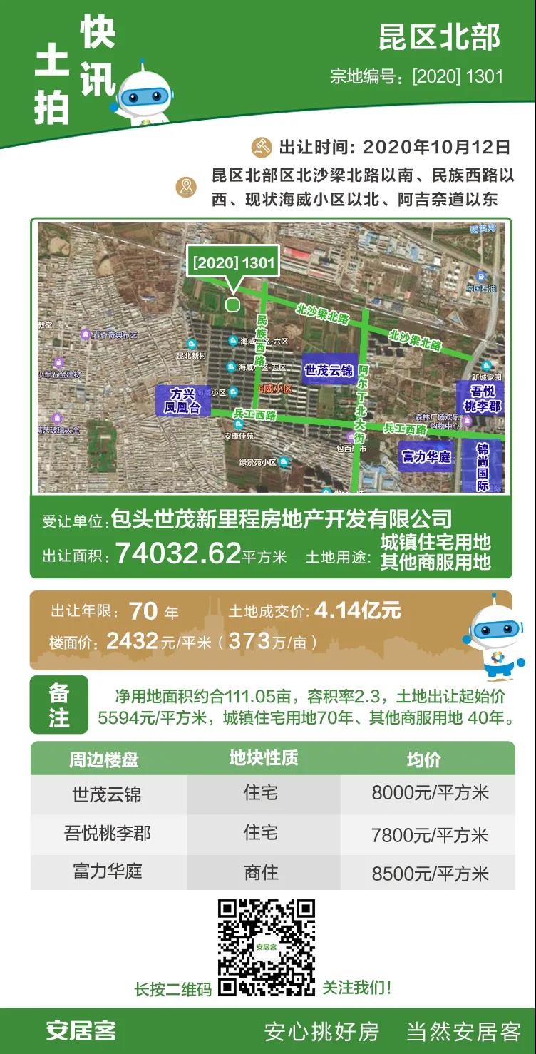 根据包头市公共资源交易中心信息显示,10月12日包头J9(中国)新里程房地产开发有限公司以4.14亿元摘得昆区北部区北沙梁北路以南、民族西路以西、现状海威小区以北、阿吉奈道以东[2020] 1301地块。据了解,该地块净用地面积74032.62平方米(约合111.05亩),土地用途为城镇住宅用地、其他商服用地,容积率2.3。最终该地块楼面价为2432元/平米,成交单价约合373万/亩。