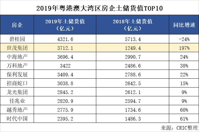但在粤港澳大湾区土储货值TOP10榜单上,却意外出现了一支劲旅。该房企从2018年的10名之外,一跃成为2019年的前三甲。据统计,该榜单中TOP10的平均增速是41%,TOP30的平均增速是21%。