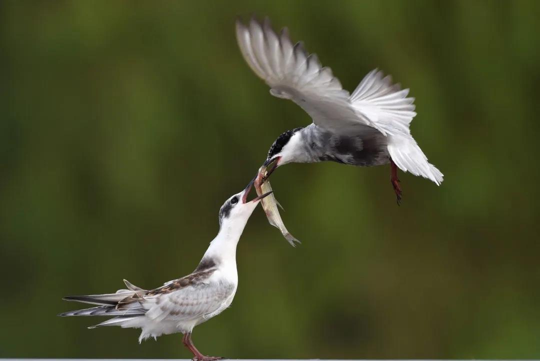一只鸟儿将捕获的鱼分给了另一只鸟儿