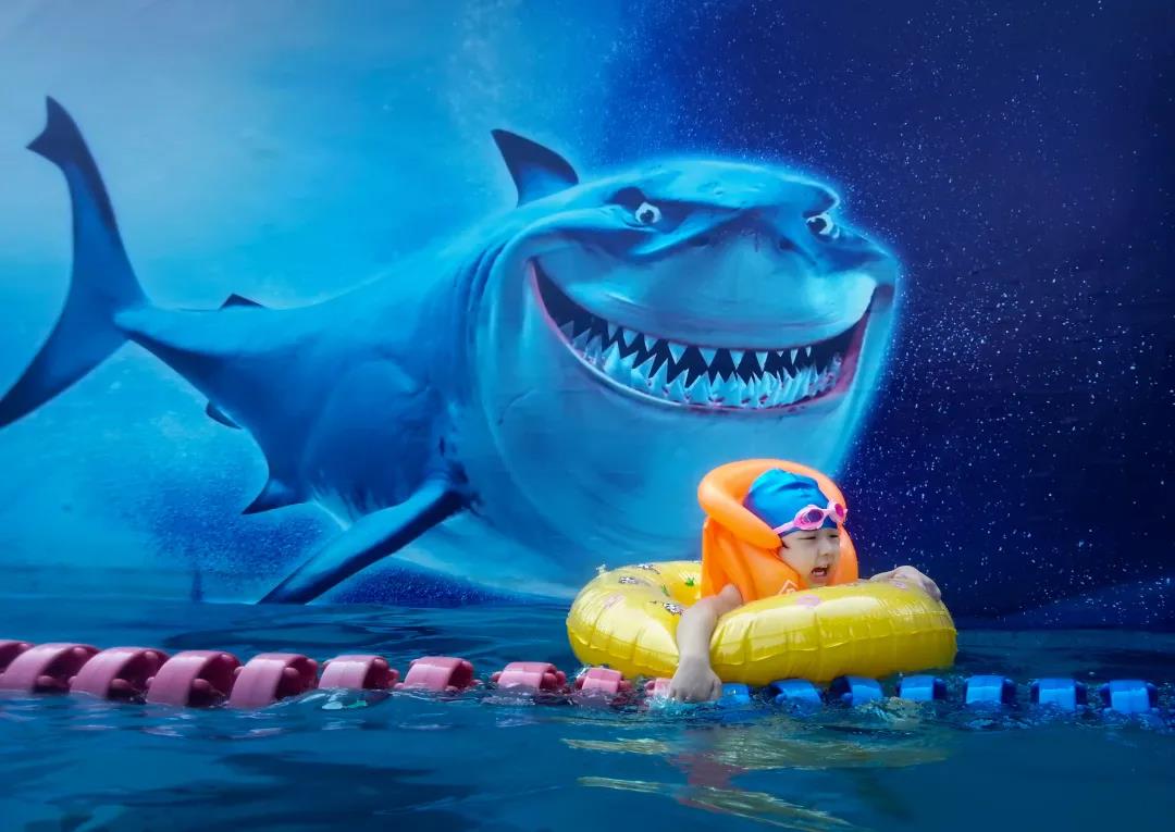 墙上的卡通鲨鱼和套着救生圈的孩子