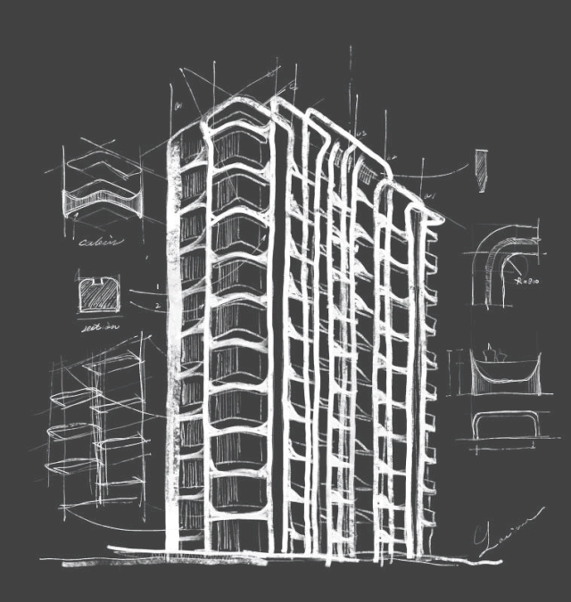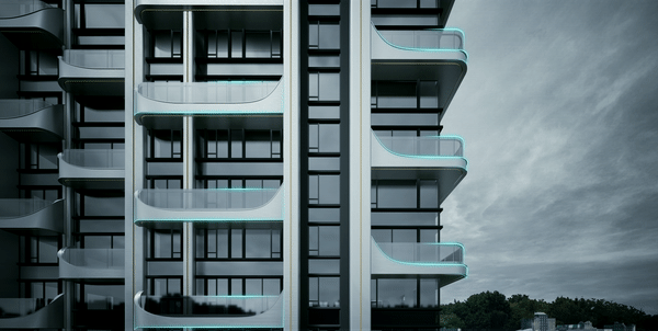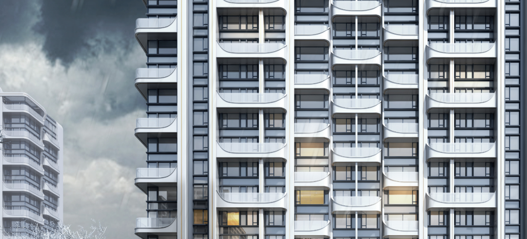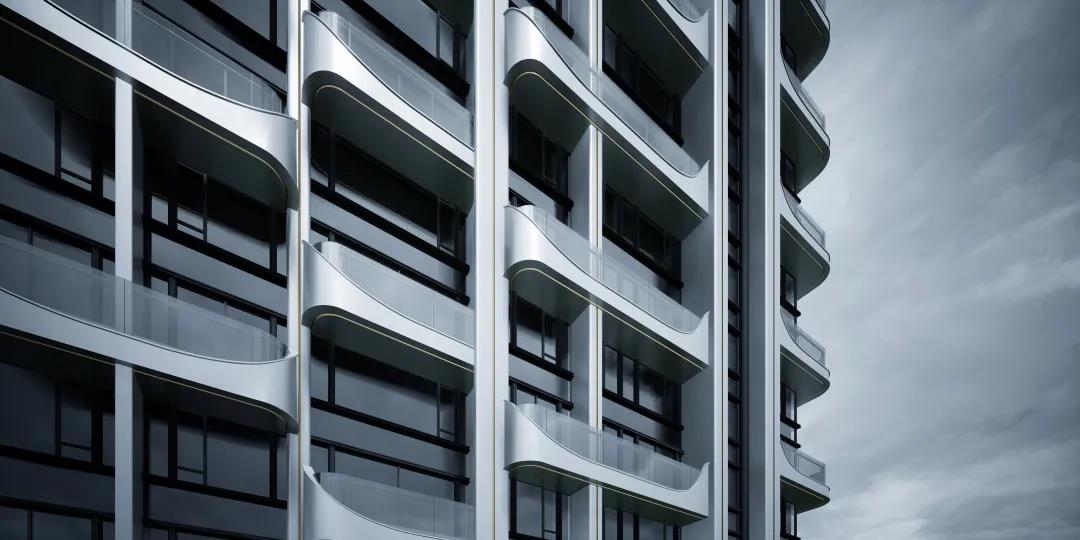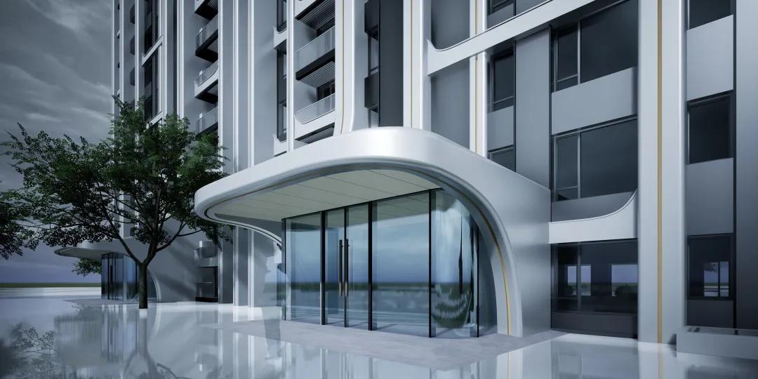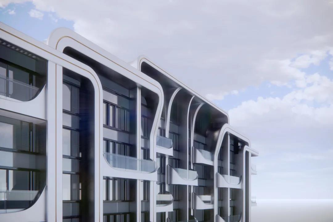 ▽ 每个竖向线条之间加入了舱体元素,在楼台的左右两侧统一的数字化模块使舱体上翘,不仅在二维视角增加了建筑的流畅感,打破了沉闷的普通阳台的矩形格局,同时加入了未来感更强的3D元素。整体望去建筑像是有无数个小太空舱体,在时光隧道中穿梭。