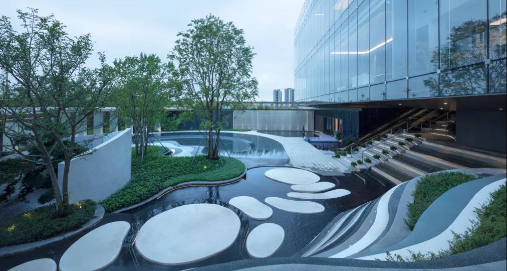 深、浅灰的仿石地面在色彩上与主景观形成对比