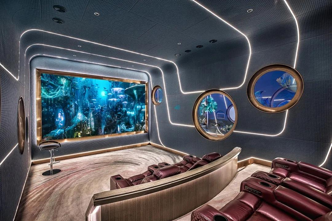室内细节藏品极尽考究,家庭影院模拟空间舱概念,观影环境带入强烈科技感。意大利新锐鬼才设计师Matteo Cibic(马泰奥·西比克)之作驴子先生,法国拿破仑三世时期檀木镶嵌纯铜母贝百花图案酒箱、极尽奢华的垂下的水晶吊灯……