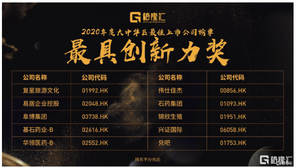 复星旅游文化(01992.HK)、伟仕佳杰(00856.HK)、易居企业控股(02048.HK)、石药集团(01093.HK)、阜博集团(03738.HK)、锦欣生殖(01951.HK)、基石药业-B(02616.HK)、兴证国际(06058.HK)、华领医药-B(02552.HK)、兑吧(01753.HK)排名不分先后