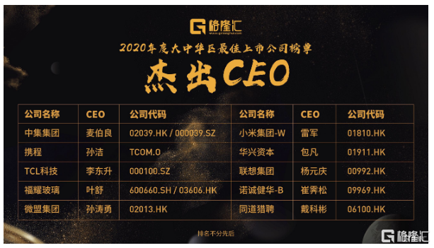 中集集团(02039.HK/000039.SZ)麦伯良 、小米集团-W(01810.HK) 雷军 、携程(TCOM.O) 孙洁、华兴资本(01911.HK) 包凡、TCL科技 (000100.SZ) 李东升、联想集团(00992.HK) 杨元庆、福耀玻璃(600660.SH/03606.HK) 叶舒、诺诚健华-B(09969.HK) 崔霁松 、微盟集团(02013.HK) 孙涛勇、同道猎聘(06100.HK) 戴科彬排名不分先后