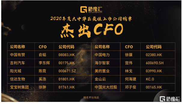 中国有赞(08083.HK)俞韬、中国电力(02380.HK)徐骥、吉利汽车(00175.HK)李东辉、海尔智家(600690.SH)宫伟、阳光城(000671.SZ)陈霓 、美的置业(03990.HK)林戈、信达生物(01801.HK)奚浩、金山云(KC.O)何海建、宝宝树集团(01761.HK)徐翀、中国光大控股(00165.HK)邓子俊排名不分先后