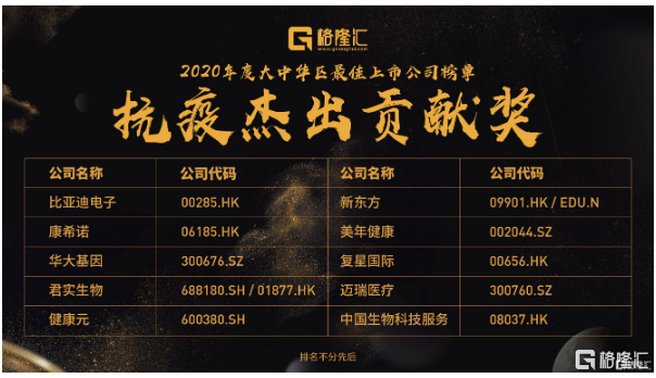比亚迪电子(00285.HK)、新东方(09901.HK/EDU.N)、康希诺(06185.HK)、美年健康(002044.SZ)、华大基因(300676.SZ)、复星国际(00656.HK)、君实生物(688180.SH/01877.HK)、迈瑞医疗(300760.SZ)、健康元(600380.SH)、中国生物科技服务(08037.HK)排名不分先后