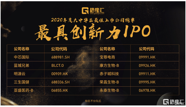 中芯国际(688981.SH)、宝尊电商(09991.HK)、蓝城兄弟(BLCT.O)、康方生物-B(09926.HK)、明源云(00909.HK)、赤子城科技(09911.HK)、三生国健(688336.SH)、荣昌生物-B(09995.HK)、亚盛医药-B(06855.HK)和永泰生物-B(06978.HK)排名不分先后