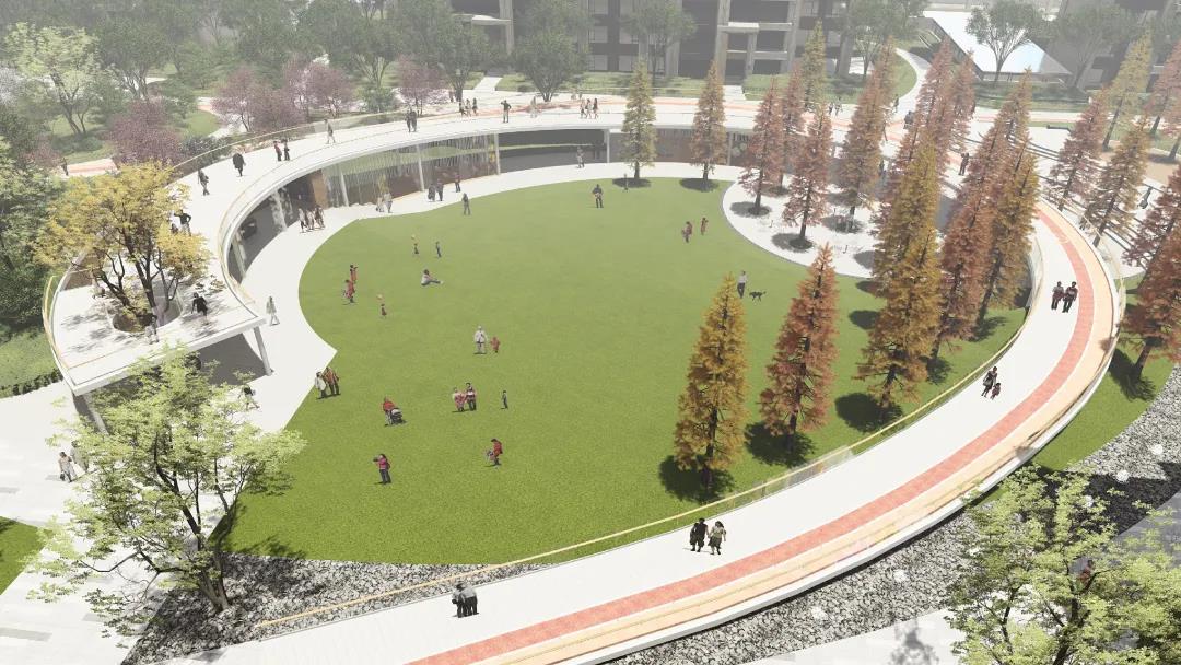 约670米“西柚活力环”因地制宜,将社区内各处景观有机串联,跑道下方的半封闭空间“生活盒子”细分为室外会客厅、健身馆、阳光剧场等社交场所,既是露天电影大放送的阶梯影院,也可以是周末举办的社区市集,充分满足冬季都市人群的社交和运动需求。
