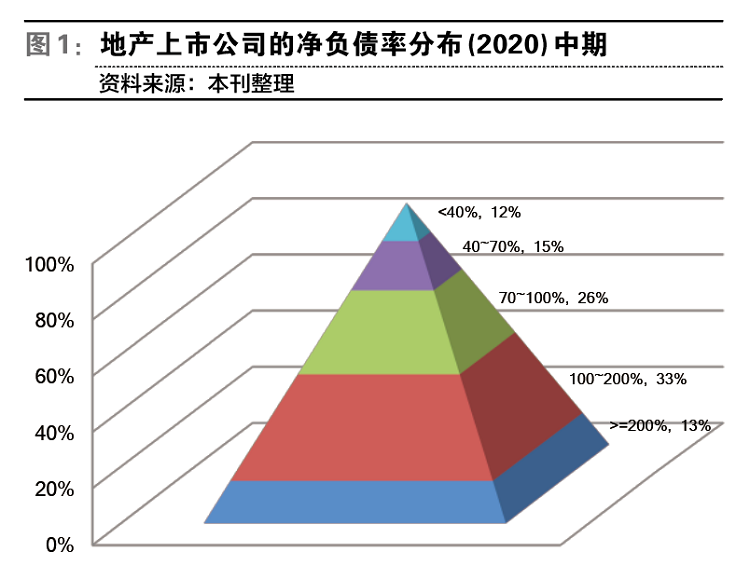 截至2020年中期,主要地产上市公司净负债率的中位数为90.3%,现金短债比的中位数为1.0,如果再考虑总负债率指标,则有26%的公司连破央行的“三道红线”,有24%的公司突破了其中“两道红线”,有37%的公司突破了“一道红线”,完全符合“三道红线”要求的公司仅占13%。