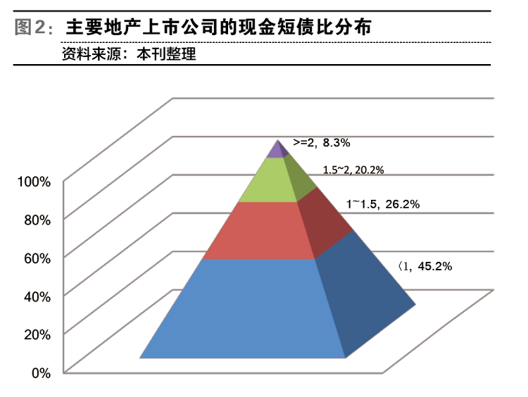 84家地产上市公司平均的现金短债比为1.14倍,中位数为1.02倍,有38家公司的现金短债比小于1,占总数的45%,有27家公司的现金短债比小于0.8,占总数的32%。相应的,主要地产上市公司短期富余资金的中位数为1.6%,其中有48%的企业面临短期资金缺口,有19%的企业面临相当于总资产10%以上的短期资金缺口。