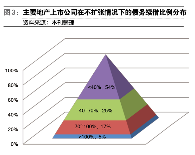 上述资金缺口需要通过新增或续借债务来弥补,根据我们的测算,在不扩张的情况下,84家地产上市公司平均的续借比例为44%,中位数也是41%,即,平均有约40%的债务无法偿还,需要通过新增或续借债务来延续资金链平衡。其中,有33家公司的最低续借比例在50%以上,占主要地产上市公司总数的39%;有18家公司的续借比例在70%以上,占主要地产上市公司总数的21%;有4家公司的续借比例在100%以上,占主要地产上市公司总数的5%。