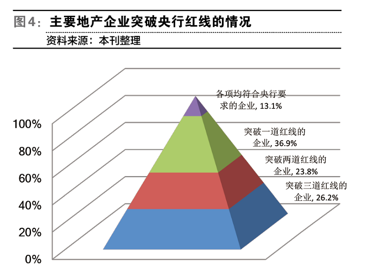 26%的地产上市公司连破“三道红线”,完全符合“三道红线”要求的公司仅占13%。龙湖地产、中国海外及万科偿债能力居前。